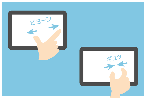 2本いじょうのゆびで、がめんをタッチし、ゆびをちかづけたりひきのばしたりします。